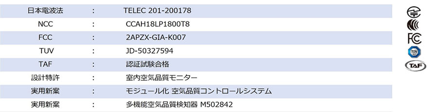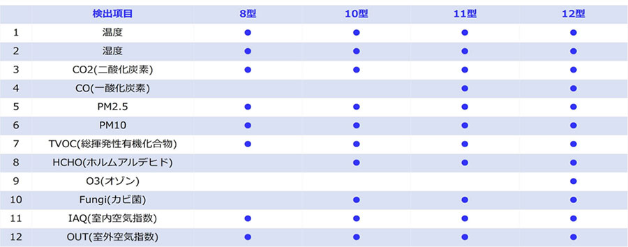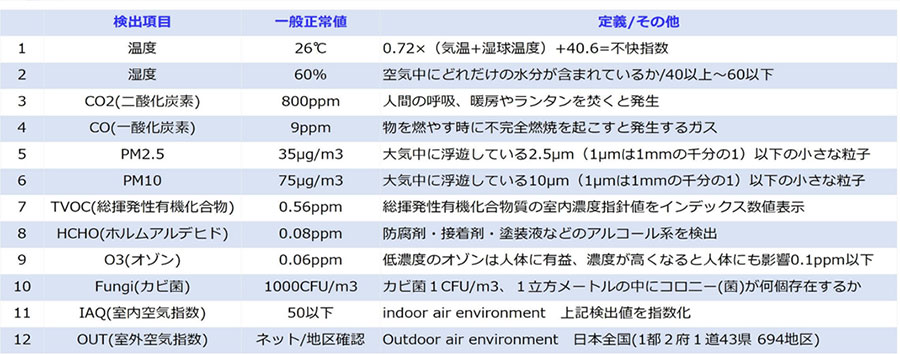 温度、湿度、PM2.5、PM10、二酸化炭素、一酸化炭素、ホルムアルデヒド、カビ、TVOC(総揮発性有機化合物)、オゾン、IAQ(室内複合指数)、OUT(室外複合指数)